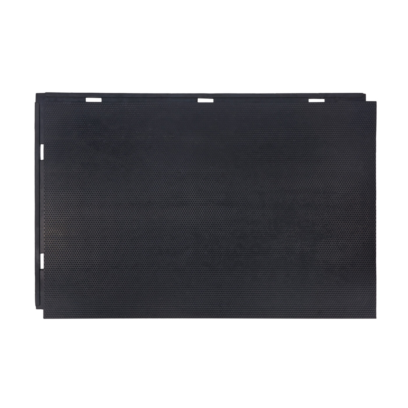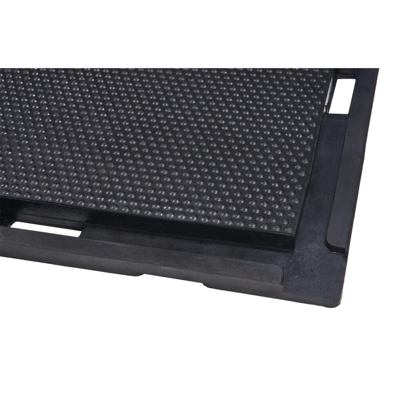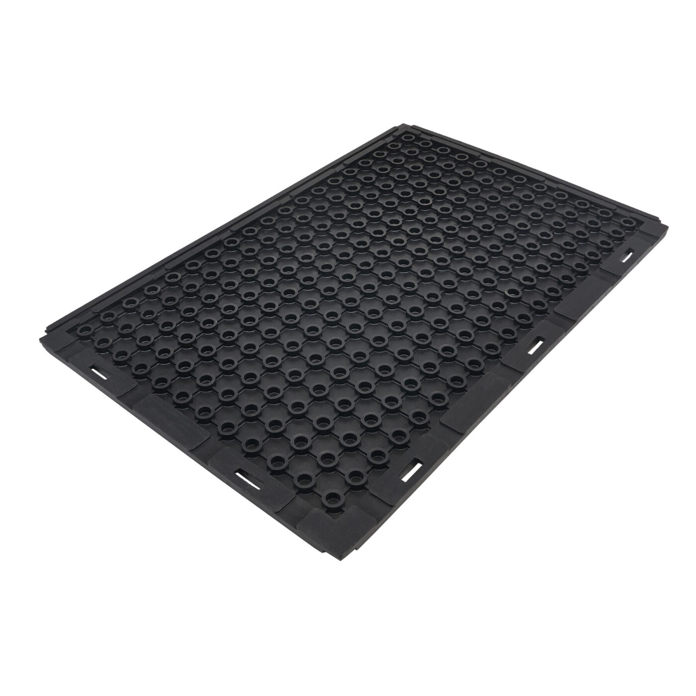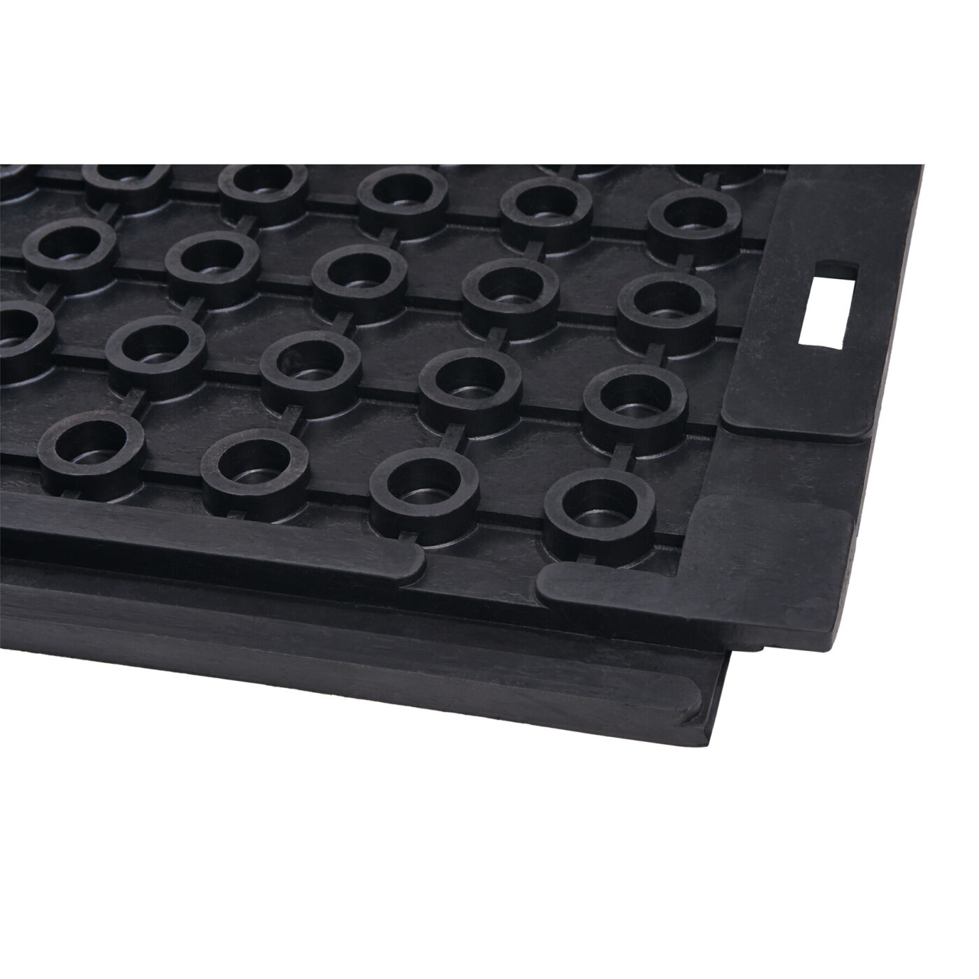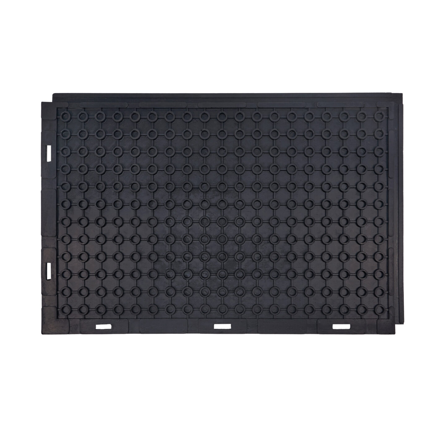 Maty gumowe do obiektów hodowlanych zostały zaprojektowane z myślą o komforcie zwierząt i higienie pomieszczeń. Ich spodnia strona wyposażona jest w system pierścieni podporowych i kanałów drenażowych, które skutecznie odprowadzają wilgoć, zapobiegając jej gromadzeniu się pod matą. Jednocześnie tworzy się warstwa izolacyjna, chroniąca zwierzęta przed zimnem podłoża – szczególnie istotna w starszych budynkach o nieogrzewanych posadzkach. Maty posiadają rowek obwodowy, który ułatwia ich stabilne układanie i zapobiega przesuwaniu się podczas użytkowania. Elastyczność gumy (60-70 Shore) pozwala na dobre dopasowanie do nierówności podłoża, co przekłada się na trwałość i wygodę użytkowania. Odporność na wilgoć oraz łatwość czyszczenia sprawiają, że maty wspierają utrzymanie wysokiego poziomu higieny w obiektach hodowlanych.